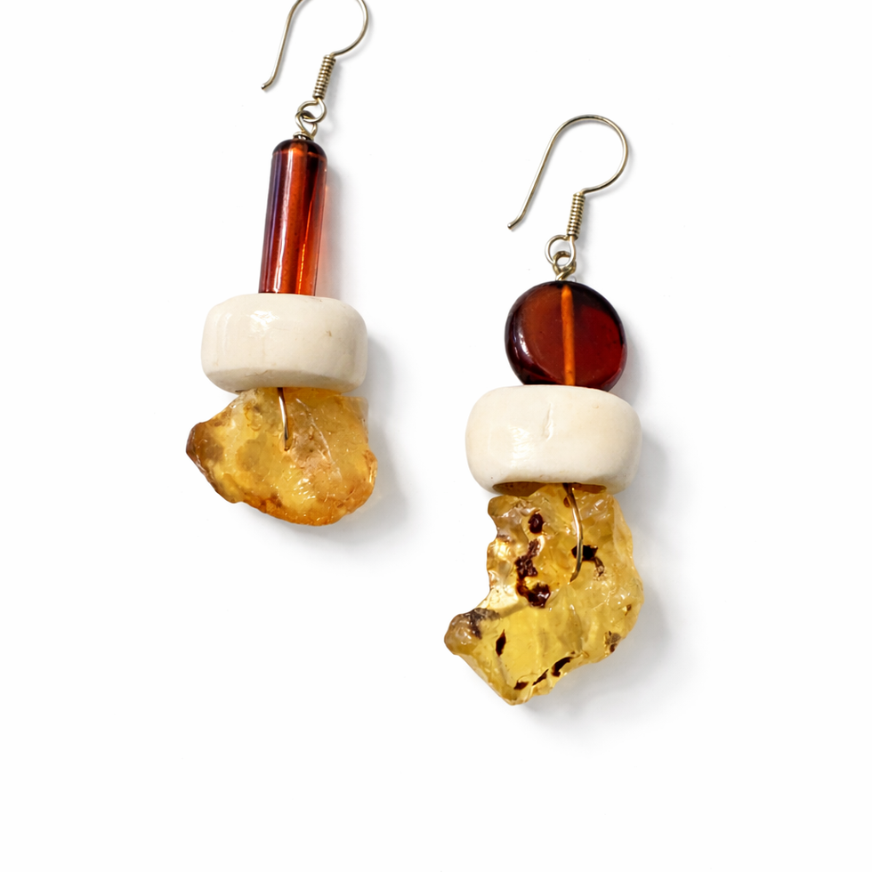 The amber is anchored by a substantial, hand-carved bone-style spacer in a soft ivory tone, providing a bold, earthy contrast. The design is topped with a polished, deep-amber glass bead that draws the eye upward and balances the raw energy of the lower drop. Suspended from minimalist gold-toned hooks, these drops are surprisingly lightweight, offering a sophisticated "Quiet Luxury" vibe for the modern wanderer.