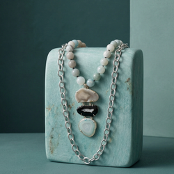 The Azure Triptych Set by Myke Harris Long Jewelry Designs is a breathtaking exploration of nautical contrast. This dual-strand masterpiece is designed for the woman who carries the spirit of the ocean wherever she goes. It features a harmonious clash between a delicate, shimmering strand of micro-faceted sea-foam and aquamarine-toned stone beads and a bold, statement-making industrial-finish chunky link chain that evokes the strength of a ship’s anchor.