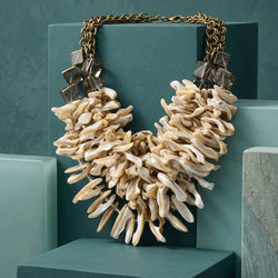 The Aegean Tide Collar is a monumental achievement in the Myke Harris Long (MHL) Jewelry Designs signature collection. This architectural masterpiece features a breathtaking "fringe" of hand-selected, cream-toned shell fragments, reminiscent of sun-bleached driftwood or polished mother-of-pearl. Each organic shard is tiered to create a voluminous, sculptural drape that mimics the natural movement of a crashing wave.