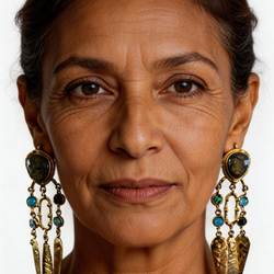 The Oceana Gilded Chandelier Earrings are a crowning achievement in the Myke Harris Long Jewelry Designs collection. These statement drops are a masterclass in artisanal texture, featuring a tiered architecture that captures the rhythmic movement of the tide. At the apex sits a hand-selected, smoky gemstone, anchored by a series of high-polish gold-toned links and shimmering turquoise-hued accents that evoke the iridescence of sea-glass and abalone.