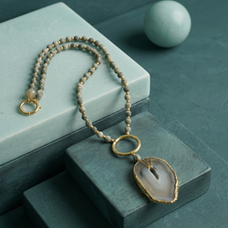 The Alabaster Gate Portal Necklace is a serene masterpiece from the Myke Harris Long Jewelry Designs collection. At its heart lies a magnificent, hand-selected agate slice, featuring a rare, natural central aperture that creates a "portal" effect. This organic stone is celebrated for its ethereal palette of cloud-grey and milky-white crystalline bands, finished with a hand-dipped, textured gold-leaf edge for a touch of gilded luxury.