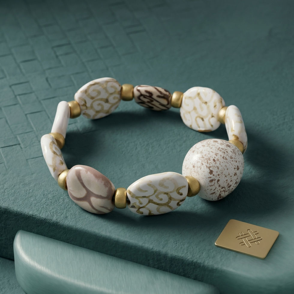 The Alabaster Swirl Mosaic is a serene anchor within the MHL Jewelry Designs heritage line. This piece features authentic Kazuri beads, hand-shaped from the clay of Mount Kenya and hand-painted by master artisans. The palette is a sophisticated "Quiet Luxury" study in neutrals—featuring a sequence of flat, oval discs adorned with delicate "caramel-on-cream" swirls and abstract motifs.
