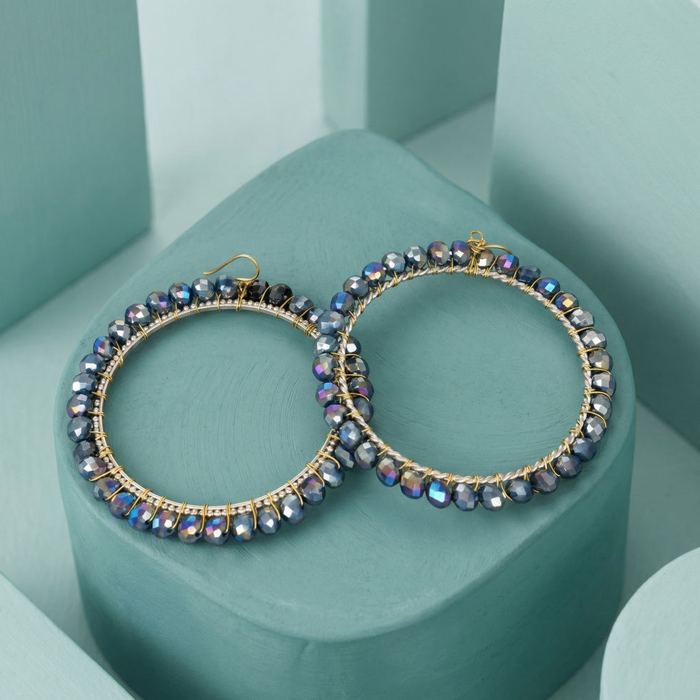 The Celestial Faceted Hoop Earrings from Myke Harris Long Jewelry Designs are a radiant reimagining of the classic hoop. These statement earrings are meticulously hand-wrapped with premium faceted crystal beads, each boasting a stunning iridescent finish. As they catch the light, the beads shift through a hypnotic spectrum of deep indigo, electric blue, and twilight purple.