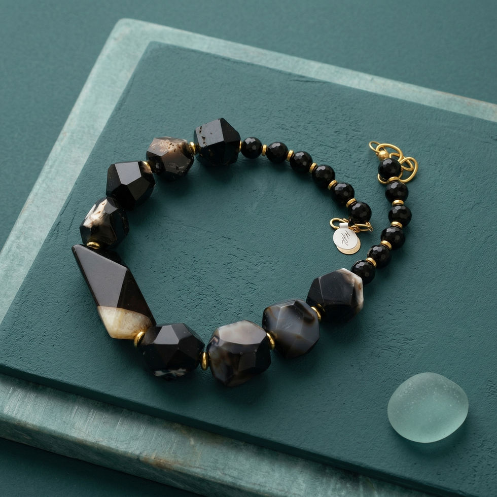 The deep, ink-black tones are interrupted by organic, smoky-grey marbling, ensuring that each stone is a unique work of natural art. Interspersed with high-shine gold-toned spacers, the necklace transitions into a delicate strand of polished black Agates, creating a sophisticated silhouette that draws the eye to its bold, architectural center.