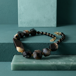 The Eclipse Geometric Onyx Necklace from Myke Harris Long Jewelry Designs is a stunning exploration of form and shadow. This statement piece features hand-selected, oversized onyx-style stones, each meticulously cut into sharp, geometric facets that catch the light with every movement.