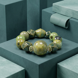 This bracelet juxtaposes high-gloss, rounded Kazuri spheres with substantial, hand-pitted geometric cubes, adding an architectural, stone-like texture that grounds the piece. The design is elevated by shimmering pavé-set crystal spacers in a matching verdant hue, providing a soft, regal sparkle that catches the light like dew on a jungle canopy. Designed for the visionary woman, this MHL piece represents a perfect harmony between global social impact and high-fashion editorial design.