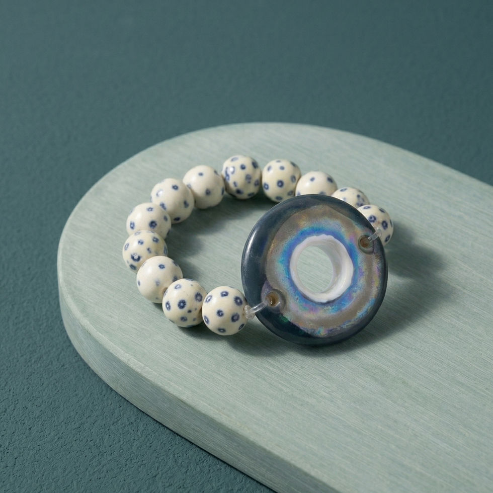 The Indigo Bloom Kazuri Halo Bracelet is a standout treasure within the MHL Jewelry Designs heritage line. This piece features a rhythmic sequence of authentic Kazuri beads, hand-shaped from the clay of Mount Kenya and hand-painted by master artisans. Each bead is a miniature canvas, showcasing delicate indigo-blue floral and dotted motifs against a soft, creamy porcelain-style background.