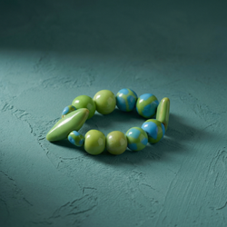 This specific MHL design features a high-gloss sequence of lime-green spheres and hand-painted azure-and-green patterned beads. The centerpiece is a striking, elongated marquise-shaped ceramic stone in a solid tropical green, providing a smooth, architectural contrast to the rounded beads. With its brilliant finish and comfortable stretch fit, the Oasis Bracelet is a wearable piece of art that bridges the gap between artisanal heritage and modern "Quiet Luxury."