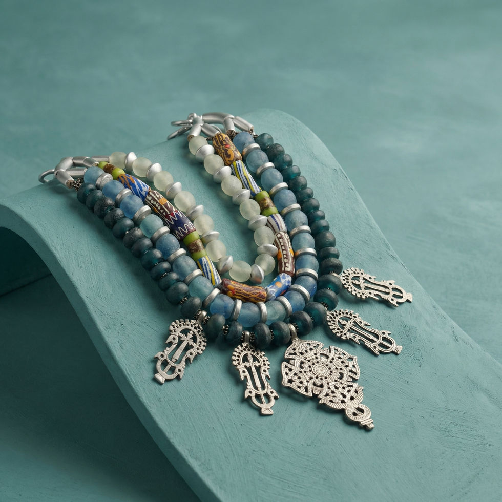 The MHL design flows from ethereal, frosted sea-glass beads in calming cerulean and deep spruce to vibrant, hand-painted African trade beads that provide a rich, artisanal warmth. The piece is anchored by a series of magnificent, silver-toned Coptic-inspired cross charms, each featuring intricate filigree work that honors traditional craftsmanship and ancient symbolism.