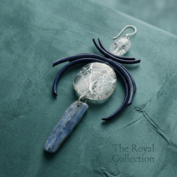 The Sovereign Kyanite & Indigo Crescent Drop is a defining centerpiece of the Royal Collection from Myke Harris Long Jewelry Designs. This sculptural masterpiece is a study in texture and tone, featuring a dramatic stack of the collection’s signature indigo-blue crescents that frame a central, translucent orb detailed with intricate silver-webbed filigree.